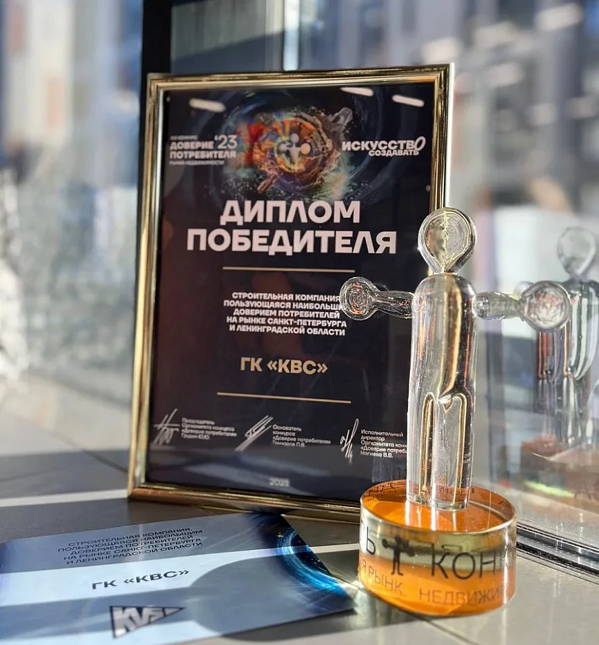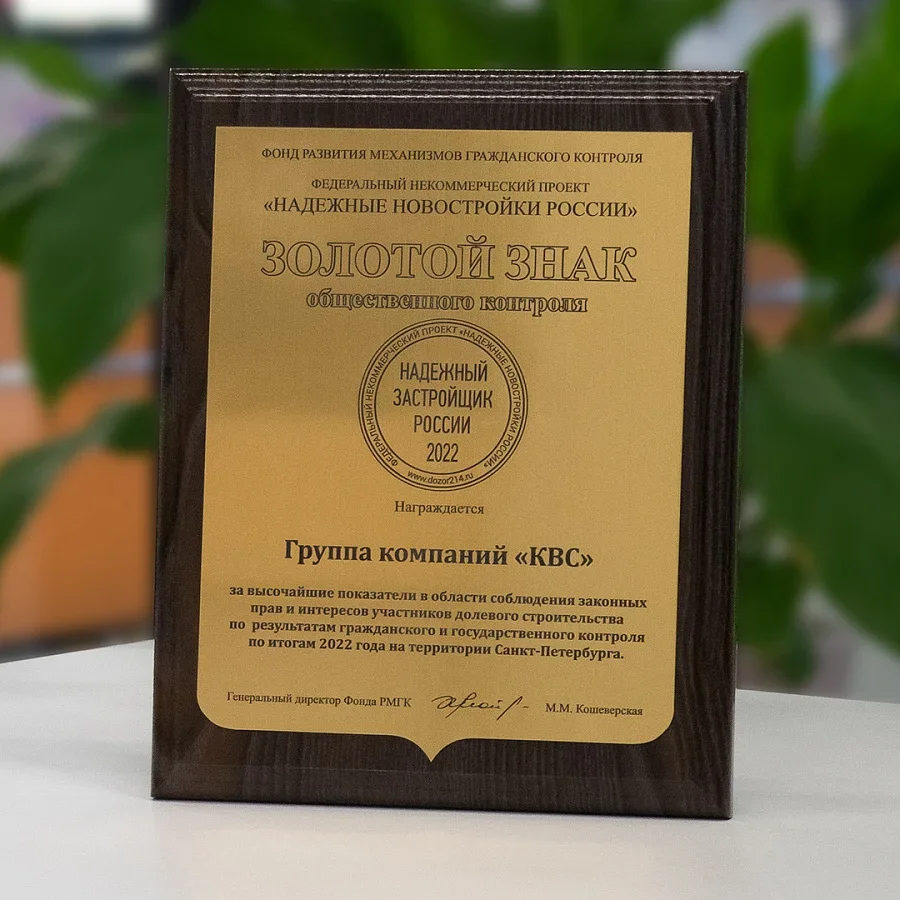 «КВС» получила Золотой знак «Надежный застройщик России-2022» за высочайшие показатели в области соблюдения законных прав и интересов участников долевого строительства в Санкт-Петербурге. За строительство в Ленобласти компании была вручена аналогичная награда.