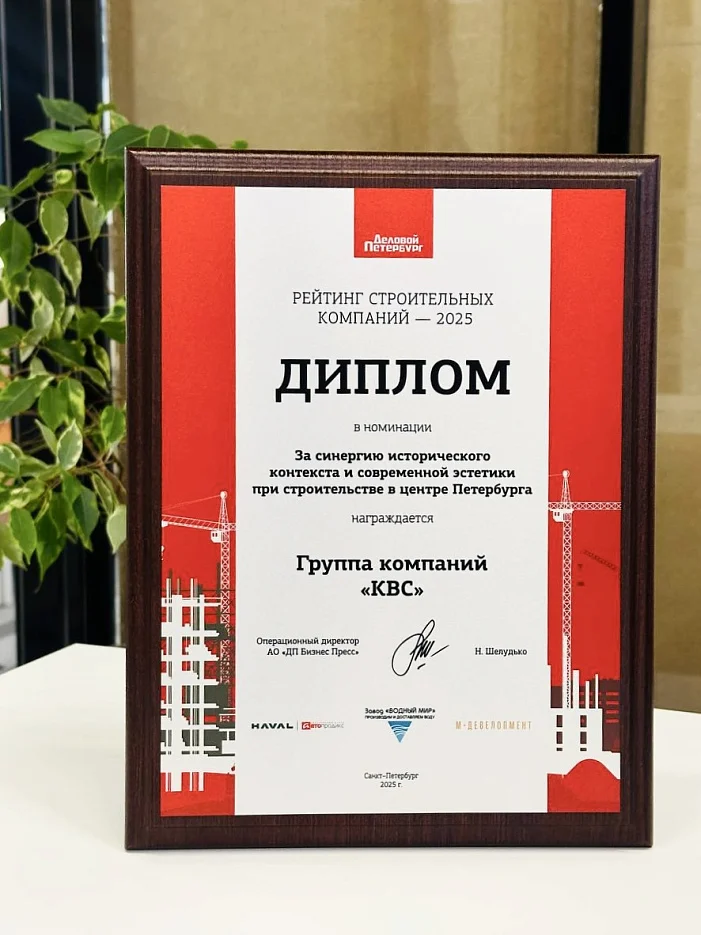 Холдинг «КВС» — один из ведущих застройщиков Санкт-Петербурга и Ленинградской области, получил высокую оценку в ежегодном рейтинге строительных организаций от издания «Деловой Петербург». Застройщику был вручён диплом в специальной номинации «За синергию исторического контекста и современной эстетики при строительстве в центре Петербурга».