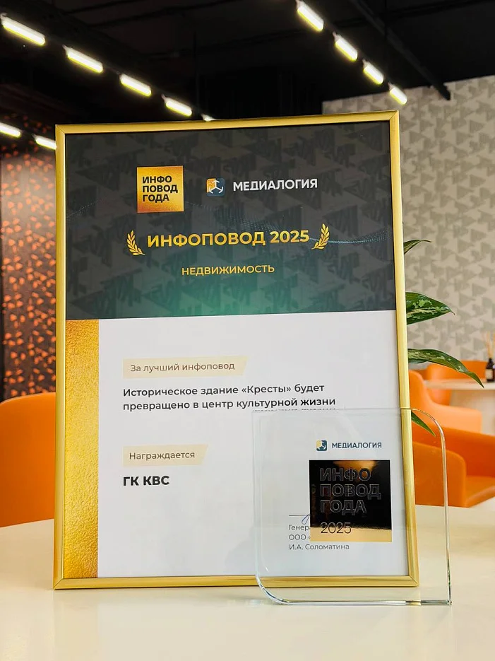 Аналитическая компания Медиалогия подвела итоги ежегодного конкурса «Инфоповод года». Проект преобразования исторического комплекса «Кресты», реализуемый группой компаний «КВС», признан «Инфоповодом года» в сегменте «Недвижимость». По итогам конкурса компании вручены стела победителя и диплом, подтверждающие этот статус.
