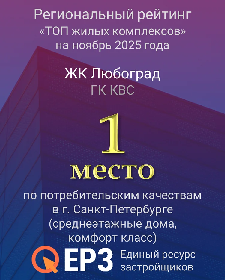 Квартал «Любоград» от группы компаний «КВС» занял первое место в рейтинге среднеэтажных новостроек Санкт Петербурга по потребительским качествам. Рейтинг составил портал ЕРЗ.РФ. В исследовании учитывались 165 параметров, включая архитектуру, благоустройство, инженерные решения и комфорт среды.