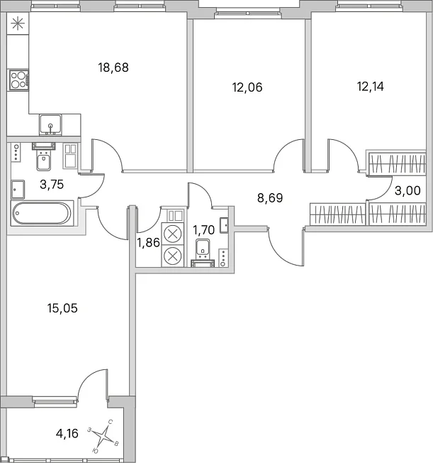 3-комнатная, 76.93 м²