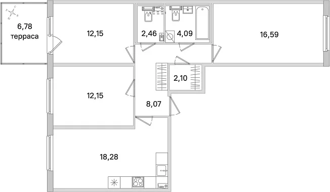 3-комнатная, 75.89 м²