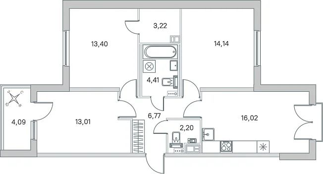 3-комнатная, 73.17 м²