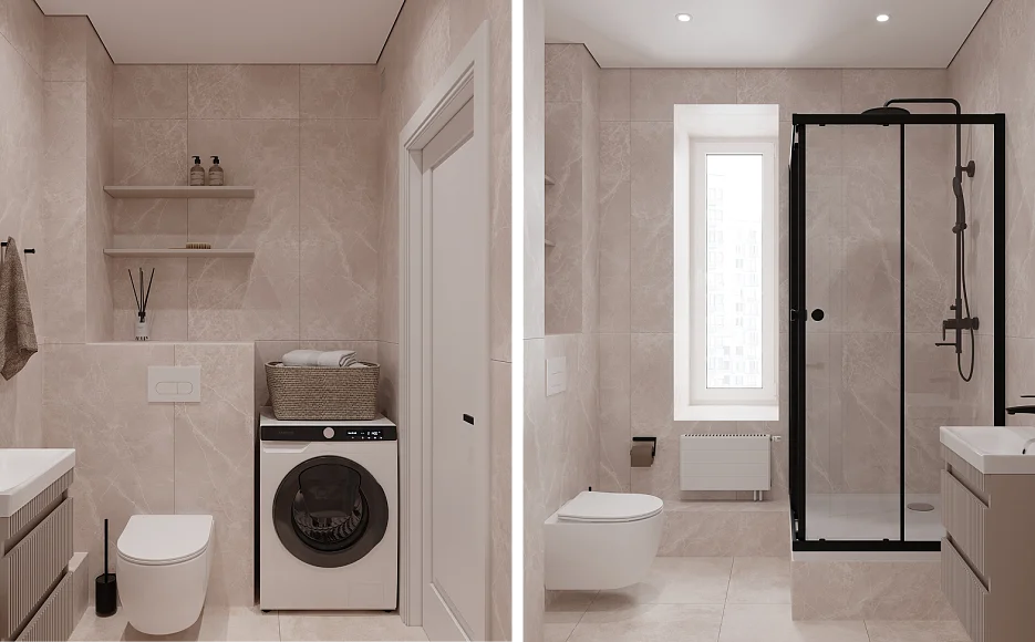 Окно в ванной наполняет пространство дневным светом и визуально увеличивает объём помещения. Этот архитектурный приём создаёт особую атмосферу уюта и расслабления, превращая ванную комнату в полноценное пространство для отдыха.