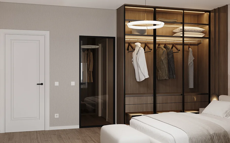 Формат, в котором комфорт продуман до мелочей. Мастер-спальня объединяет приватную зону отдыха с собственной ванной комнатой и гардеробным пространством. Такое решение создаёт ощущение уединения и делает повседневную жизнь более удобной и организованной.