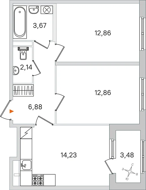 2-комнатная, 52.64 м²
