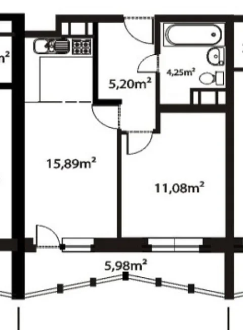 •Площадь комнаты 11,08 кв.м., кухни-столовой 15,89 кв.м.